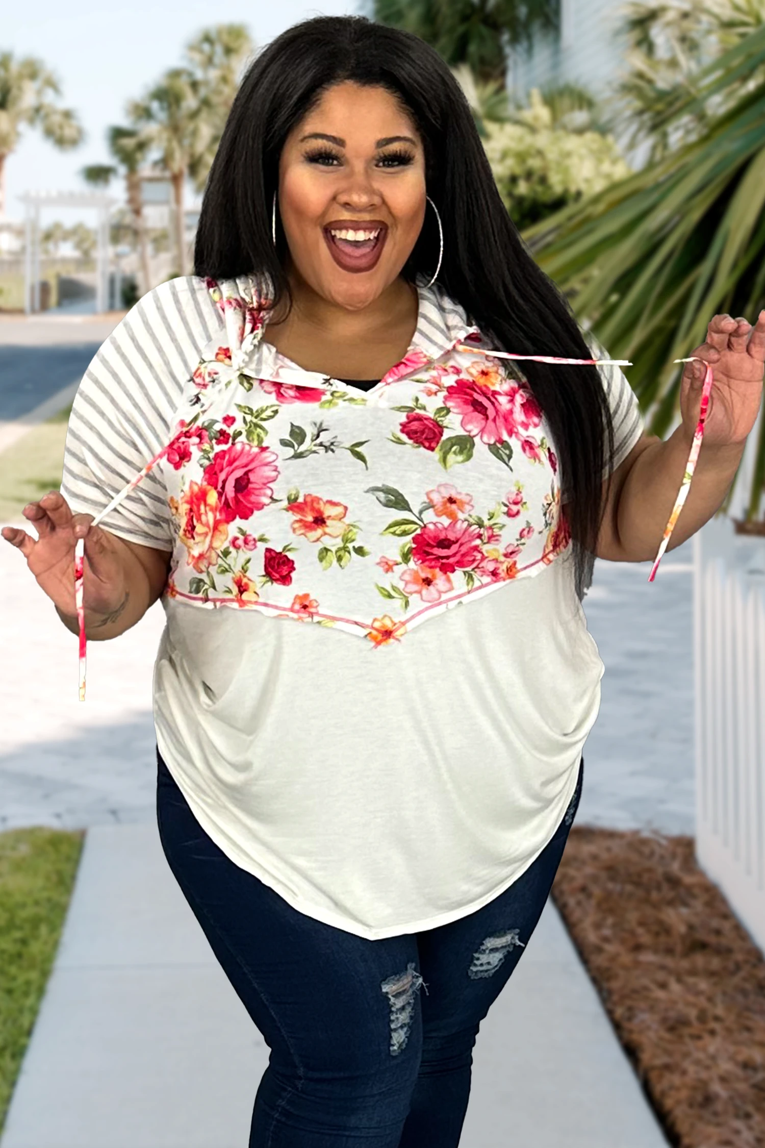 11 HD-D {Floral Influence| Ivory SALE!! Floral Grey Stripe Hoodie PLUS SIZE 1X 2X 3X