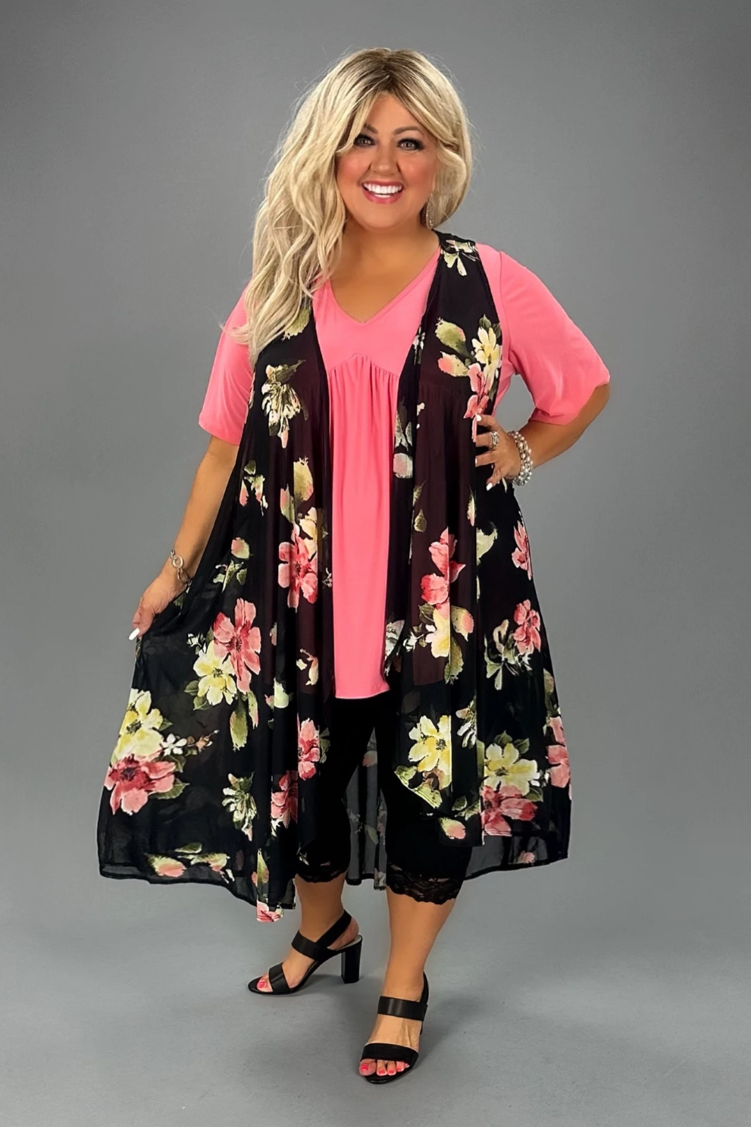 23 OT-L {Make The World Better} Black Floral Long Vest PLUS SIZE 3X