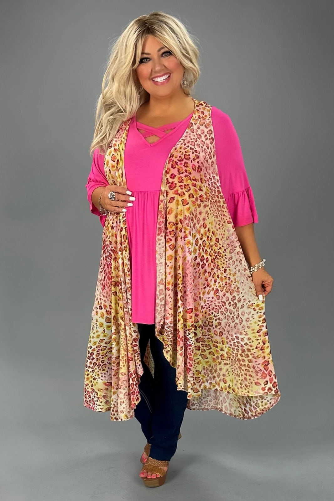 25 OT-L {Everyone Wants This} Yellow/Red Leopard Long Vest PLUS SIZE 3X