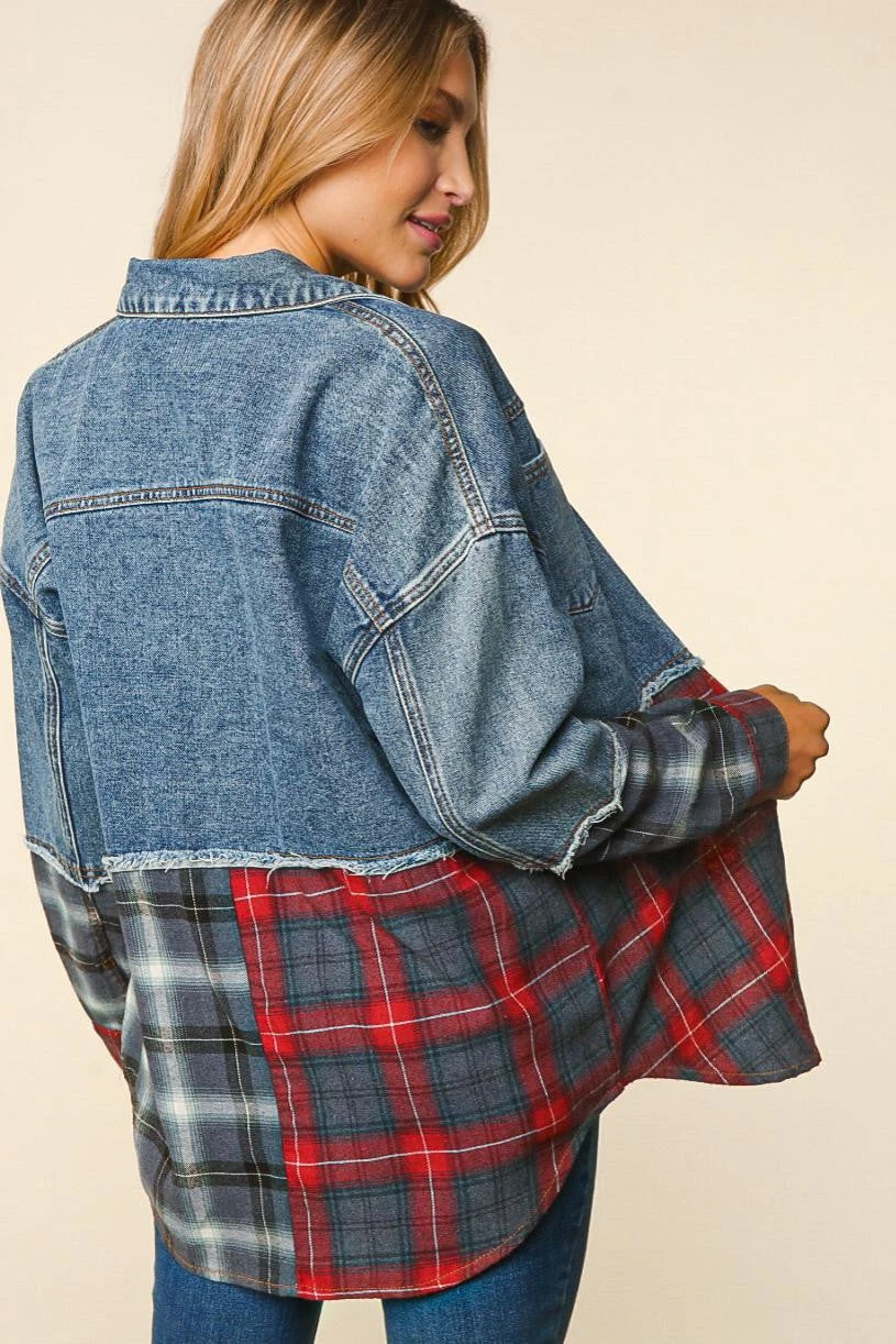 26 OT {Miss Plaid} Denim Jacket W/Red & Grey Plaid PLUS SIZE 1X 2X 3X