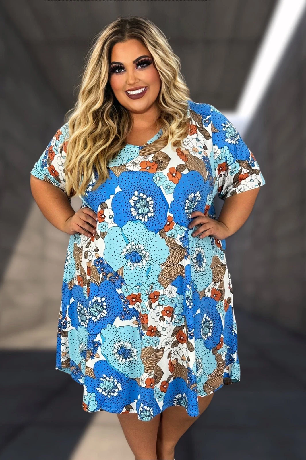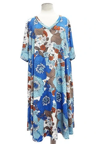 29 PSS {Joyful Journey} Blue/Tan Spotted Floral V-Neck Dress EXTENDED PLUS SIZE 4X 5X 6X