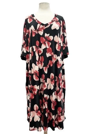 39 PSS-N {Hard To Beat} Black/Red Floral Print V-Neck Dress EXTENDED PLUS SIZE 3X 4X 5X