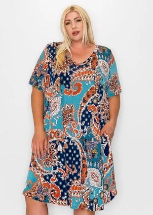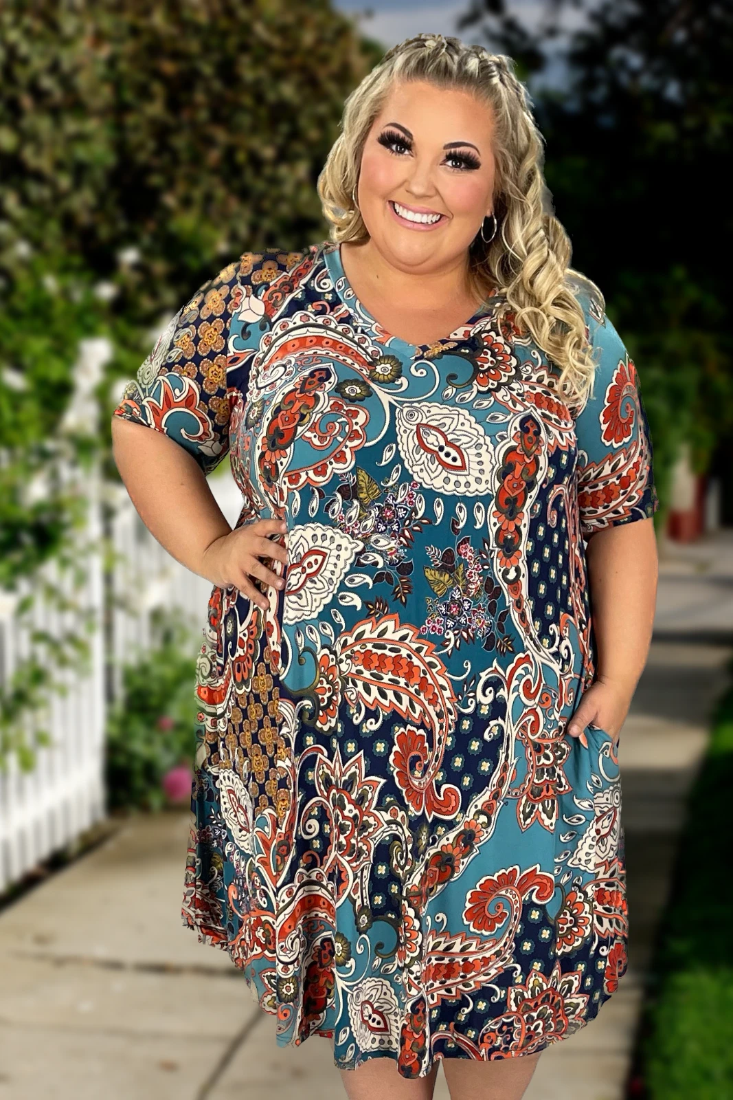 44 PSS-X {Time To Twirl} Teal/Rust Paisley Print Dress EXTENDED PLUS SIZE 3X 4X 5X