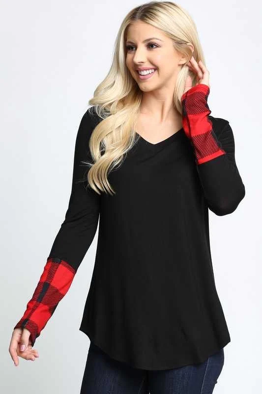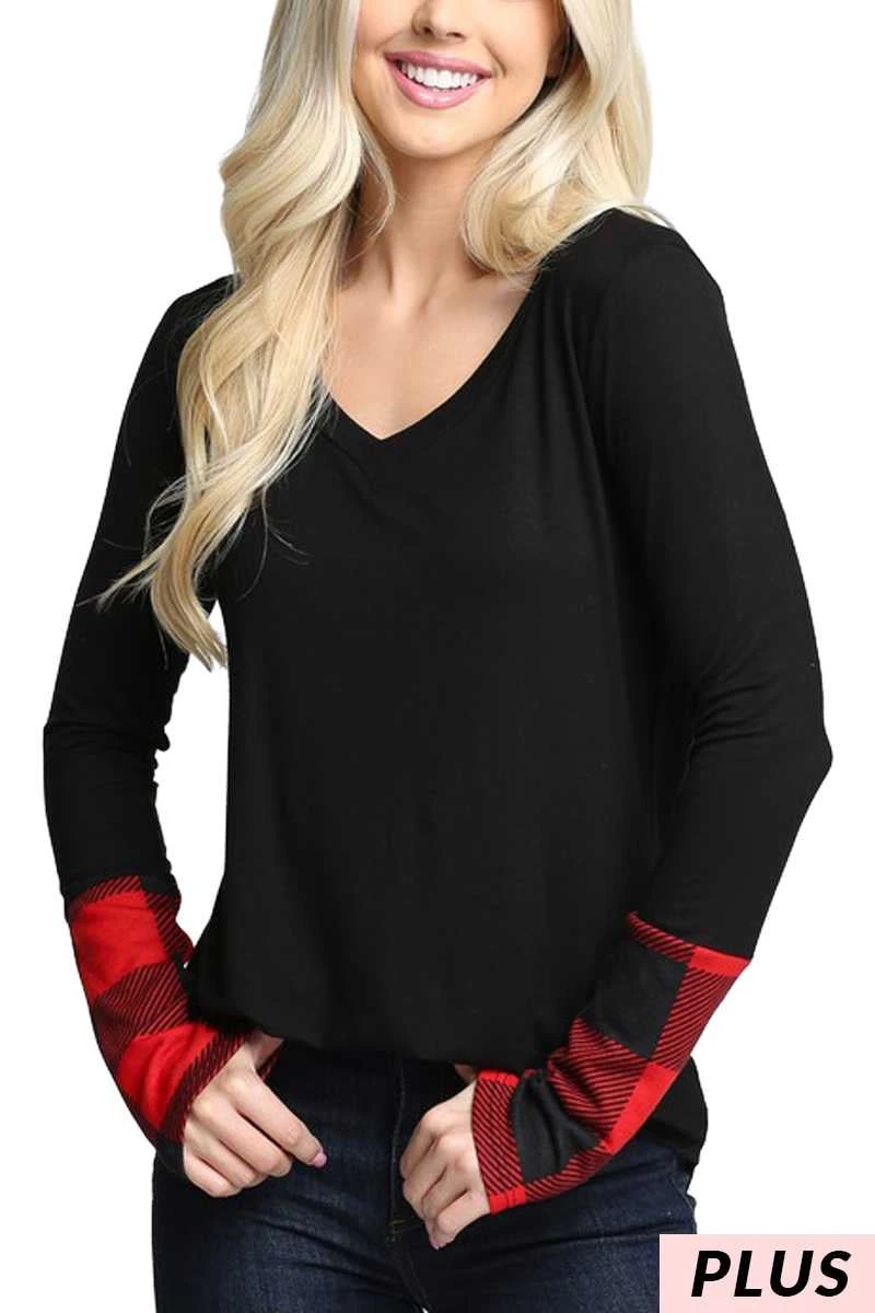 66 CP-A {Something Good} Black V-Neck Top W/Red Plaid Sleeve PLUS SIZE 1X 2X 3X
