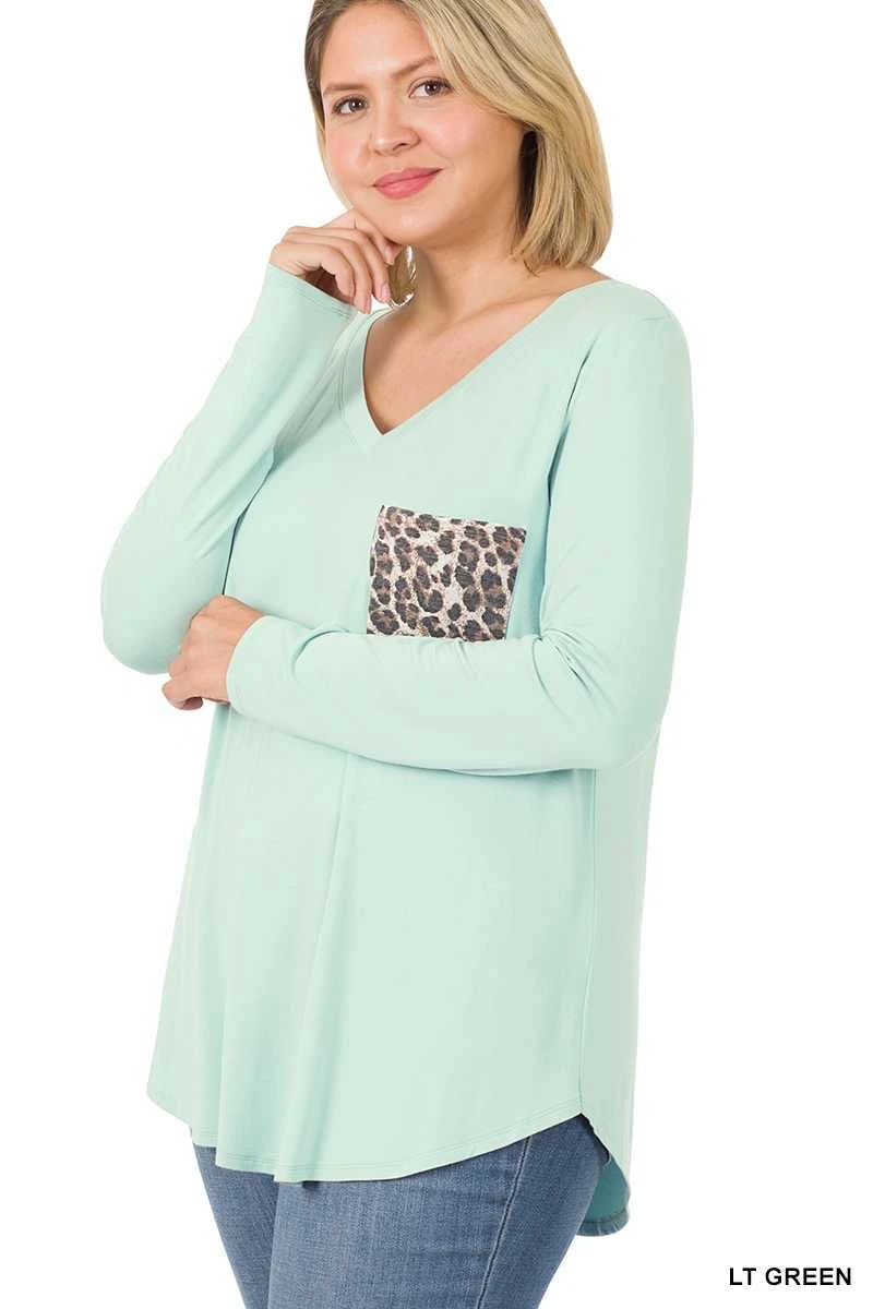 70 CP-H {Change Is Coming} Green Top W/Leopard Pocket PLUS SIZE 1X 2X 3X