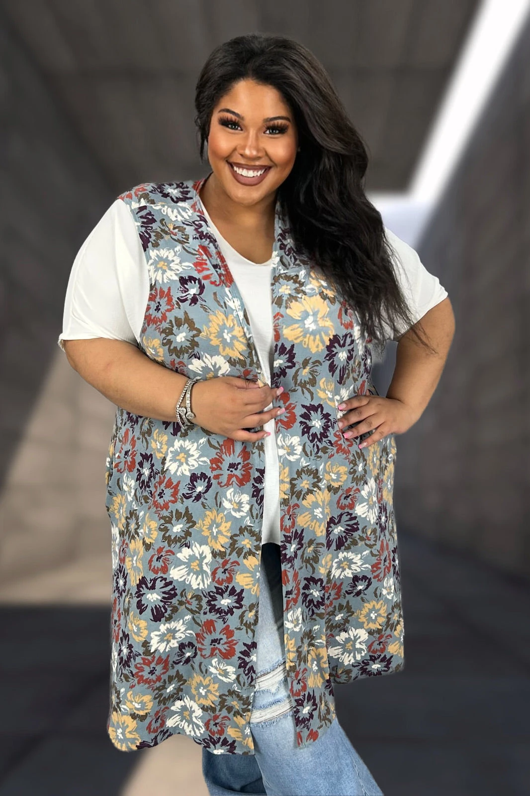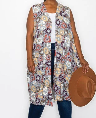 74 OT {Falling Into Fashion} Grey Floral Long Vest W/Pockets CURVY BRAND!!! EXTENDED PLUS SIZE 4X 5X 6X