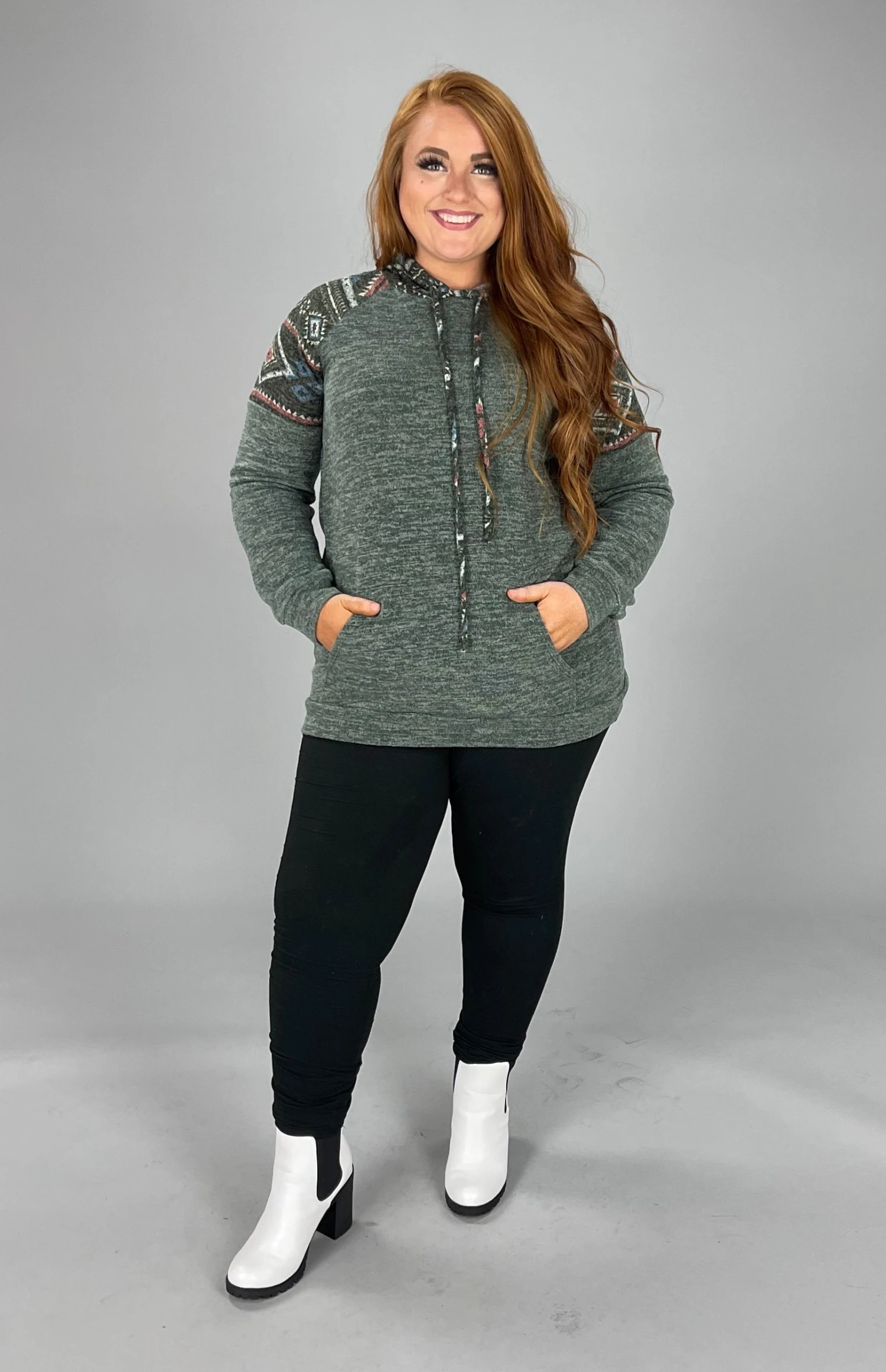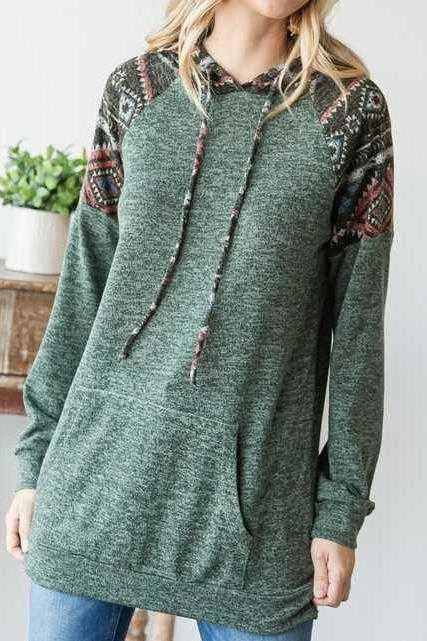 76 HD-A {Cozy On Up} Olive Hoodie W/Aztec Contrast SALE!!!! PLUS SIZE XL 2X 3X