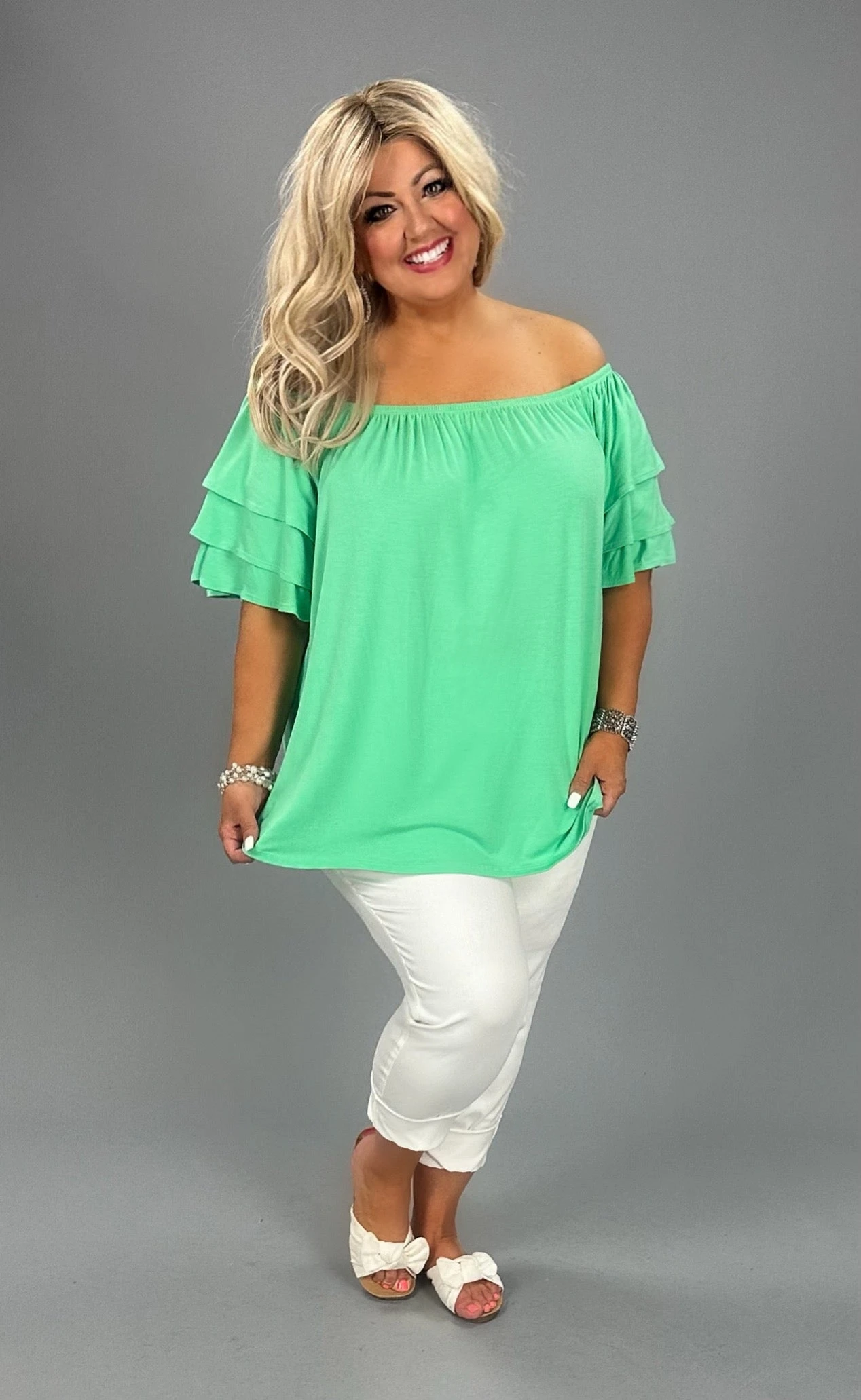 76 OS-B {Here For You} Mint Off Shoulder Ruffle Sleeve Top PLUS SIZE 1X 2X 3X