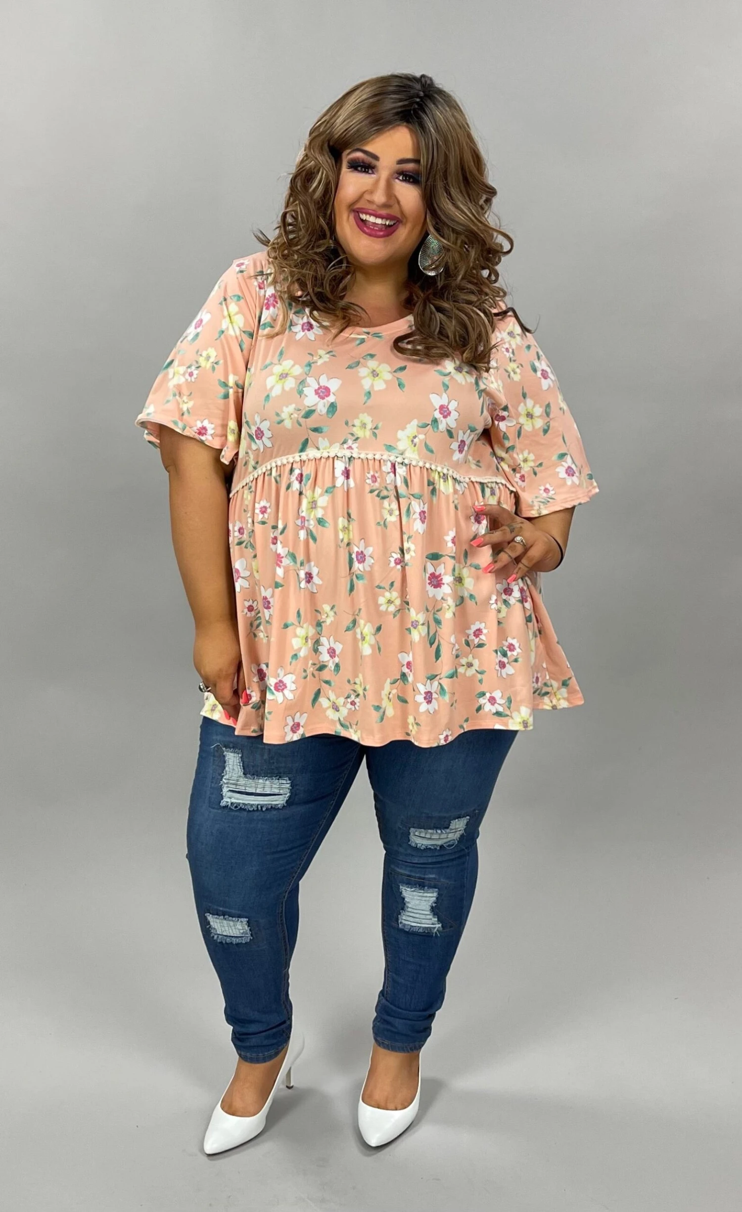 93 PSS-J {Wildflower} PEACH Floral ***FLASH SALE***Babydoll Top PLUS SIZE 1X 2X 3X