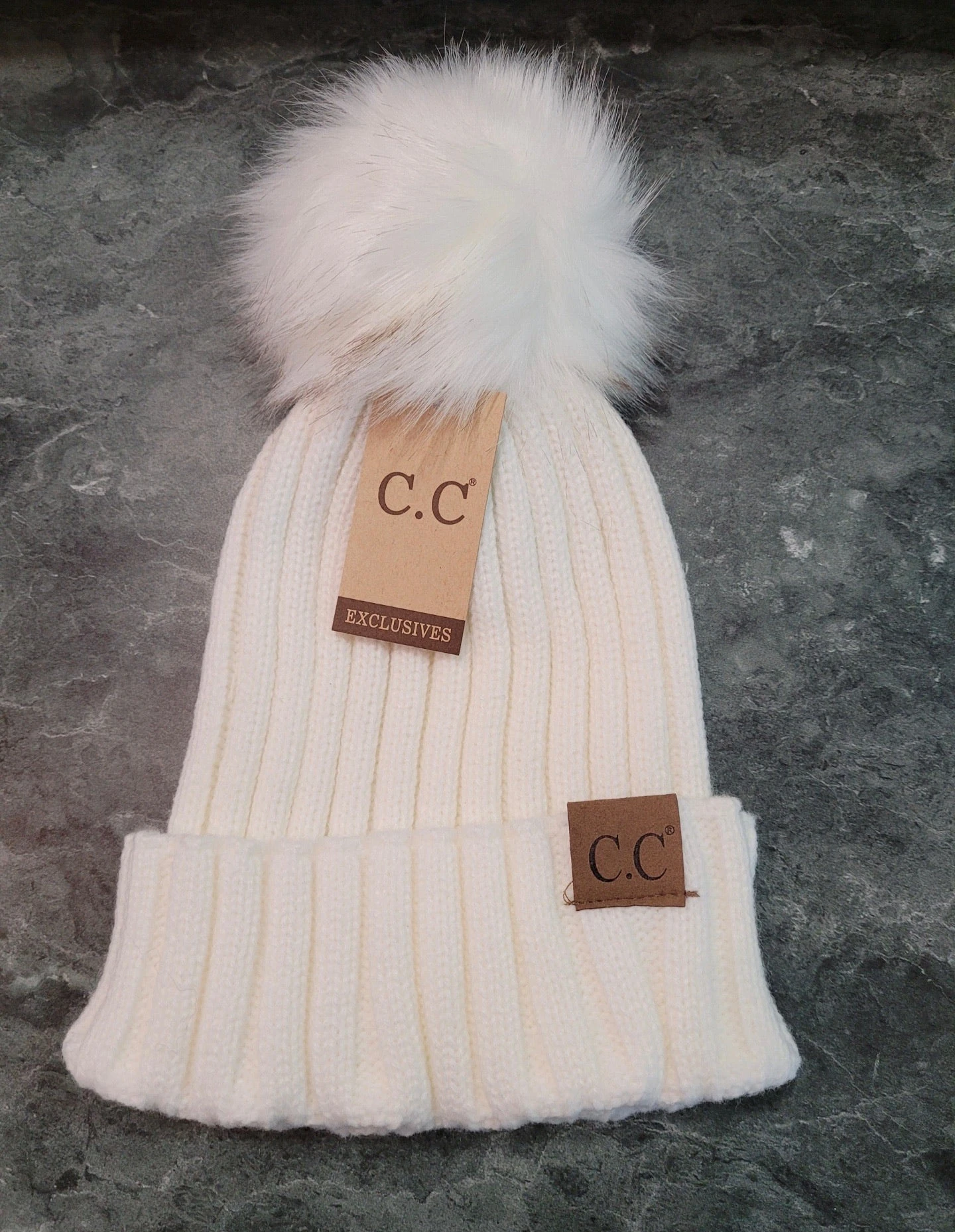 BIN/39-Ribbed Style C.C. Beanie With Matching Fur Ball