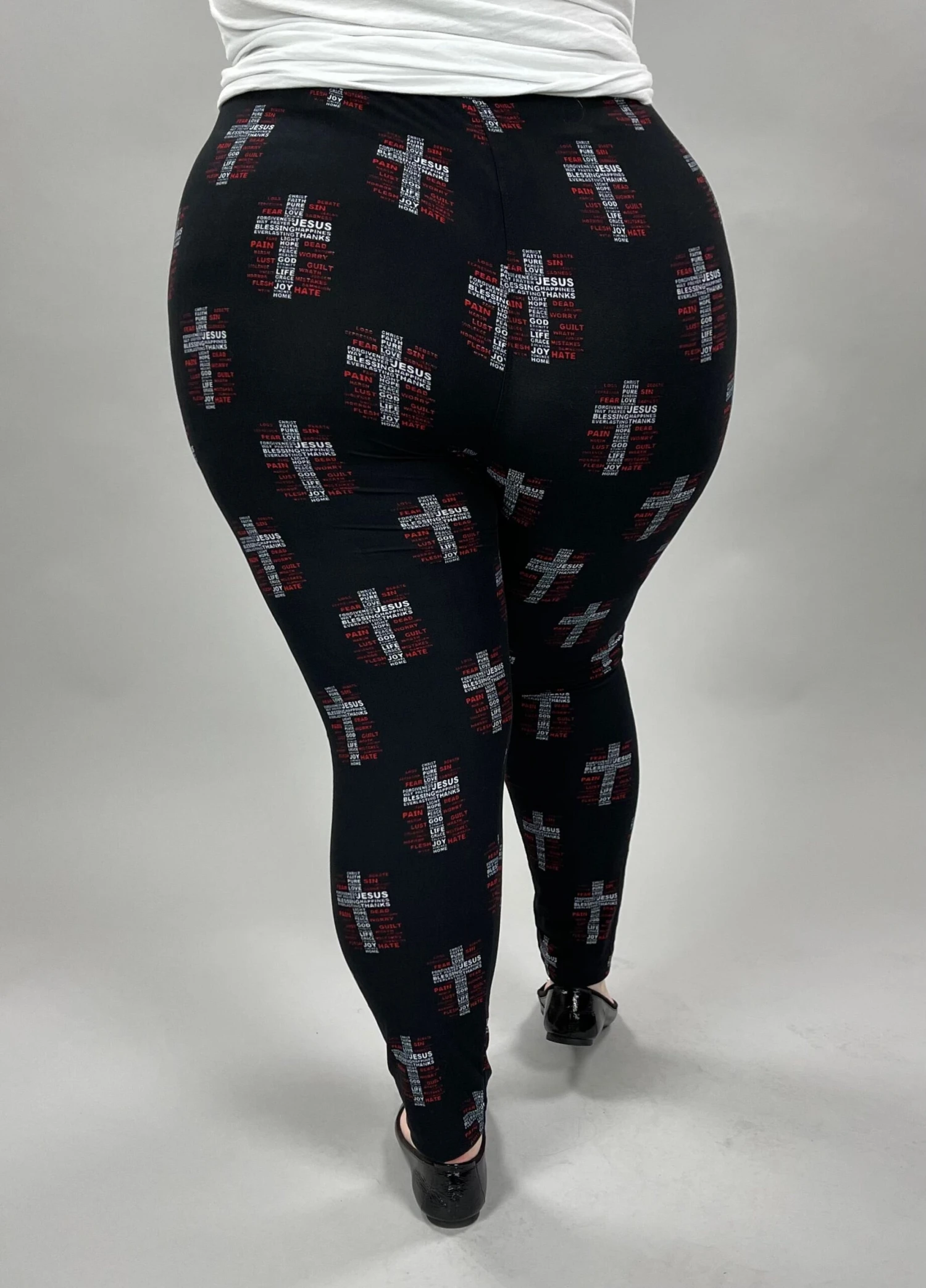 BIN-98 OR LEG-29 {Cross Of Love} Black Leggings W/Word Crosses EXTENDED PLUS LEGGINGS