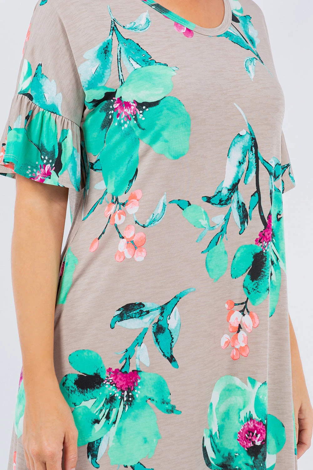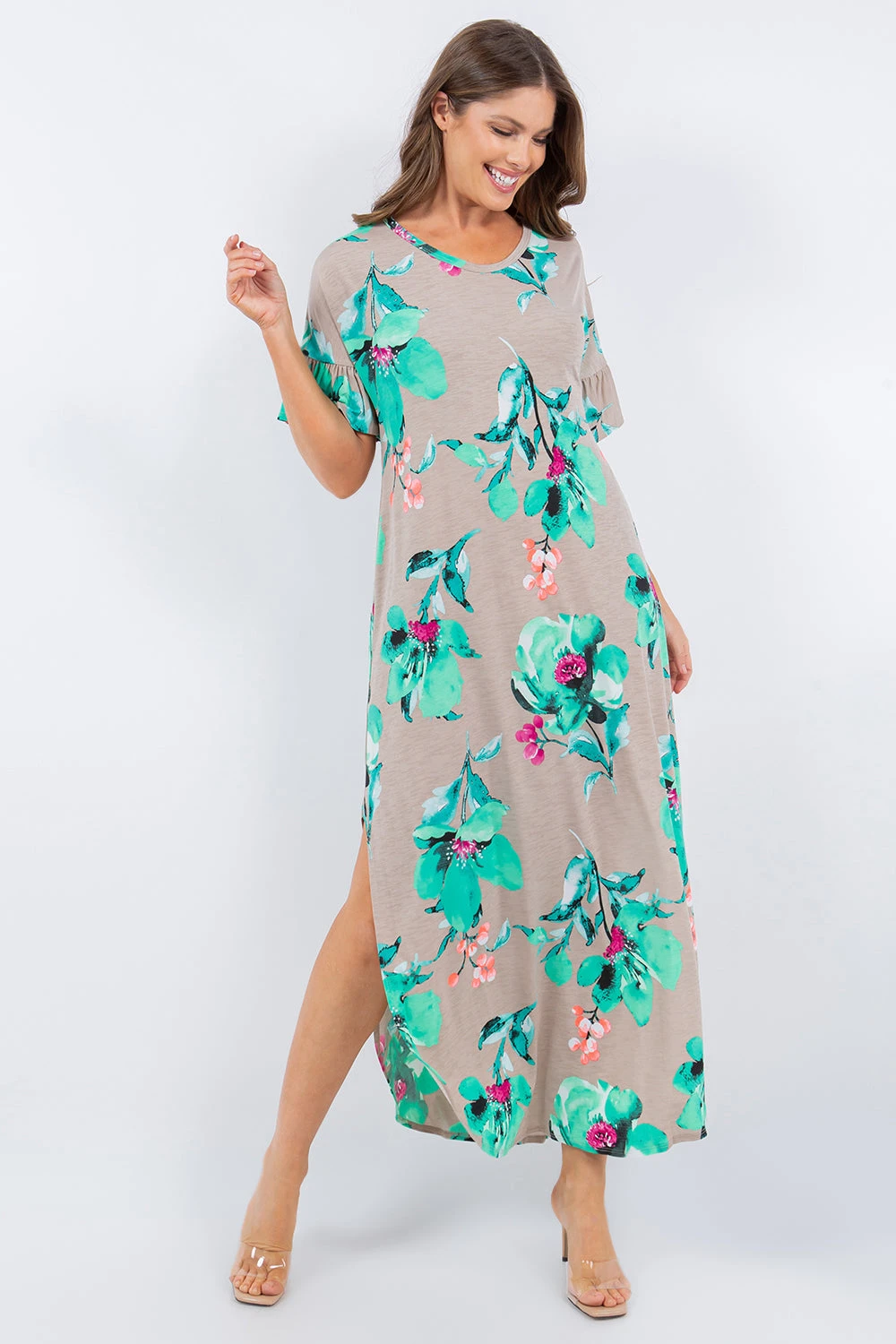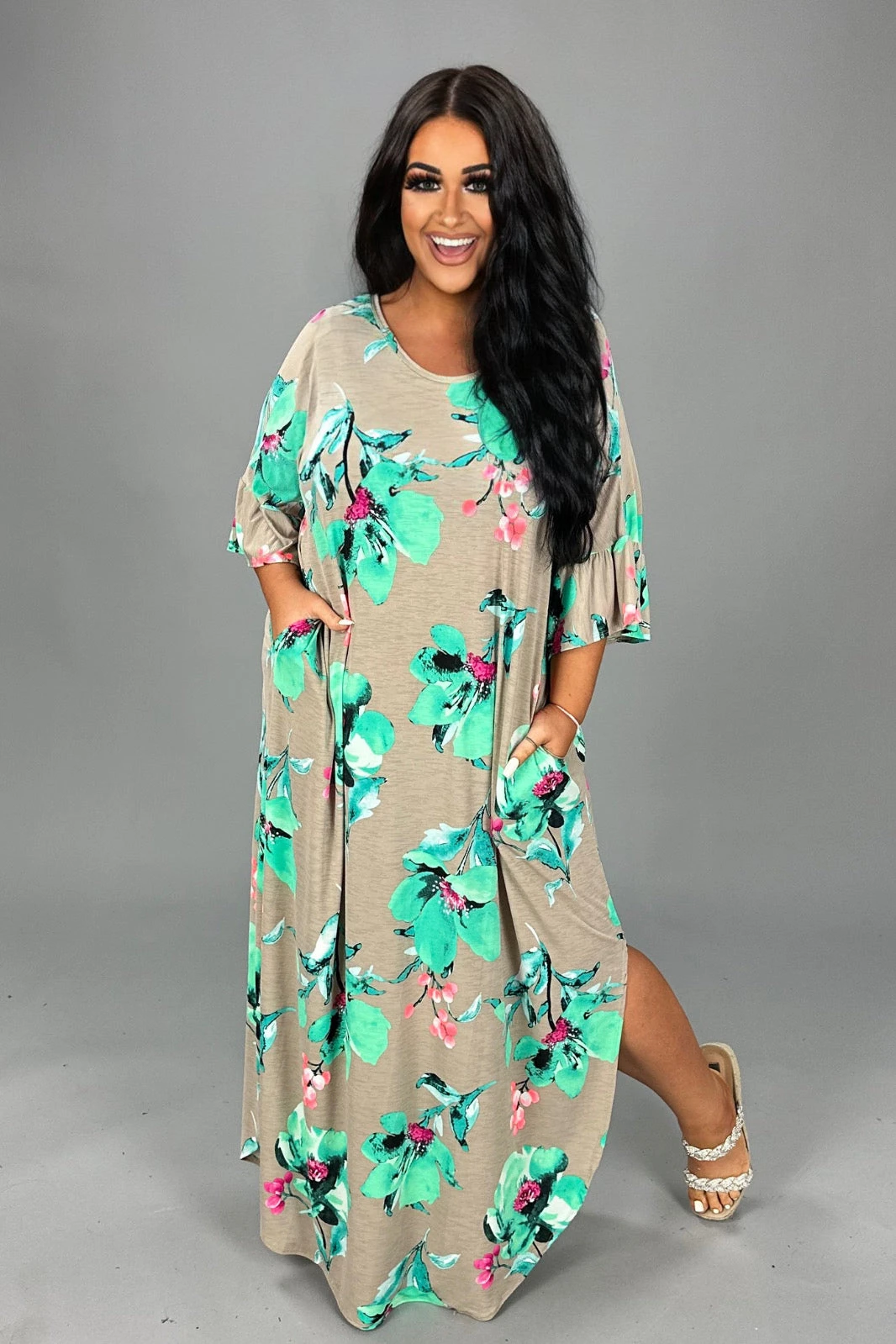 LD-V {Radiate Love} SALE! Taupe/Mint Floral Maxi Dress PLUS SIZE 1X 2X 3X