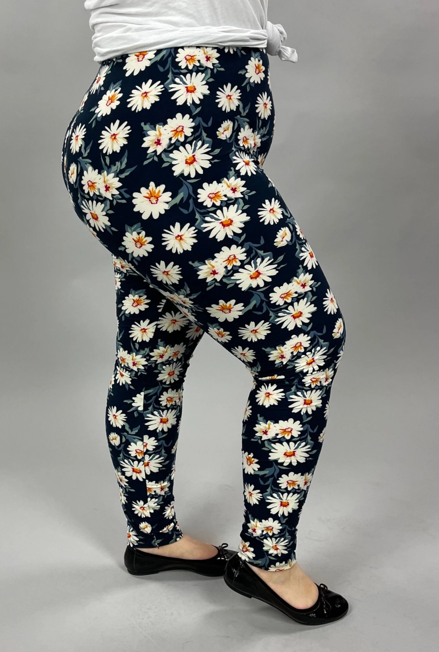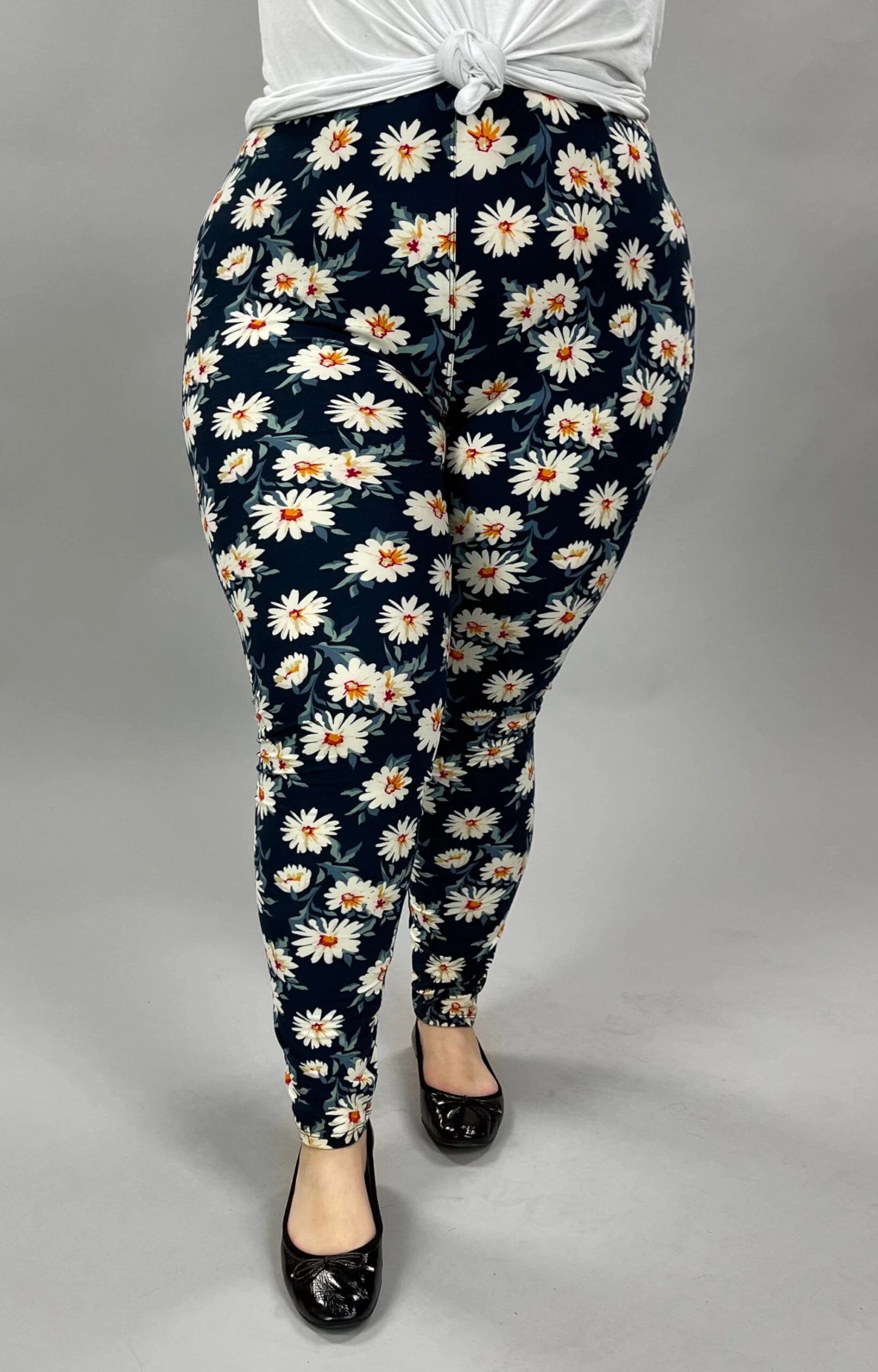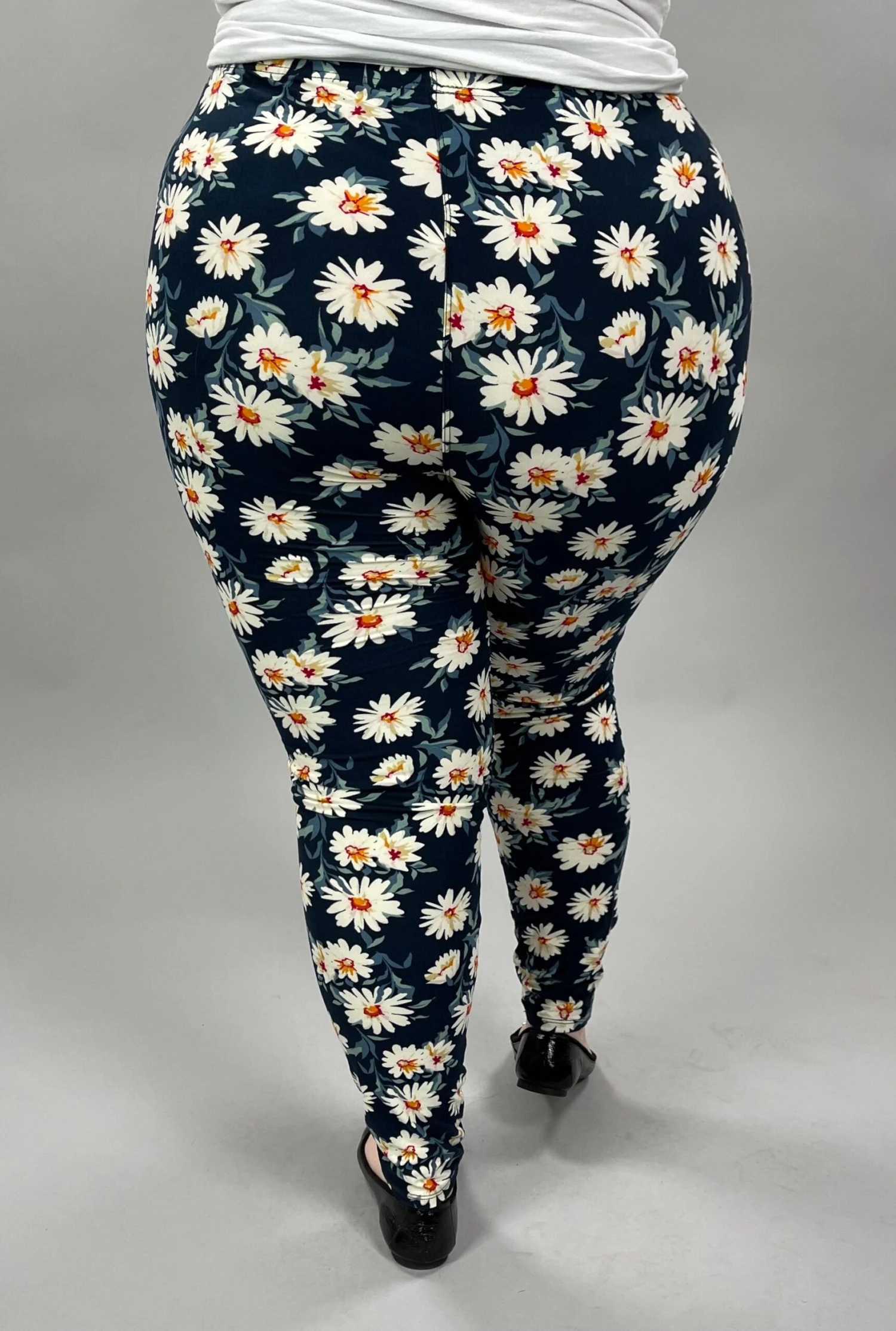 LEG-31 {Blue Daisy} Navy Daisy Printed Leggings EXTENDED PLUS SIZE