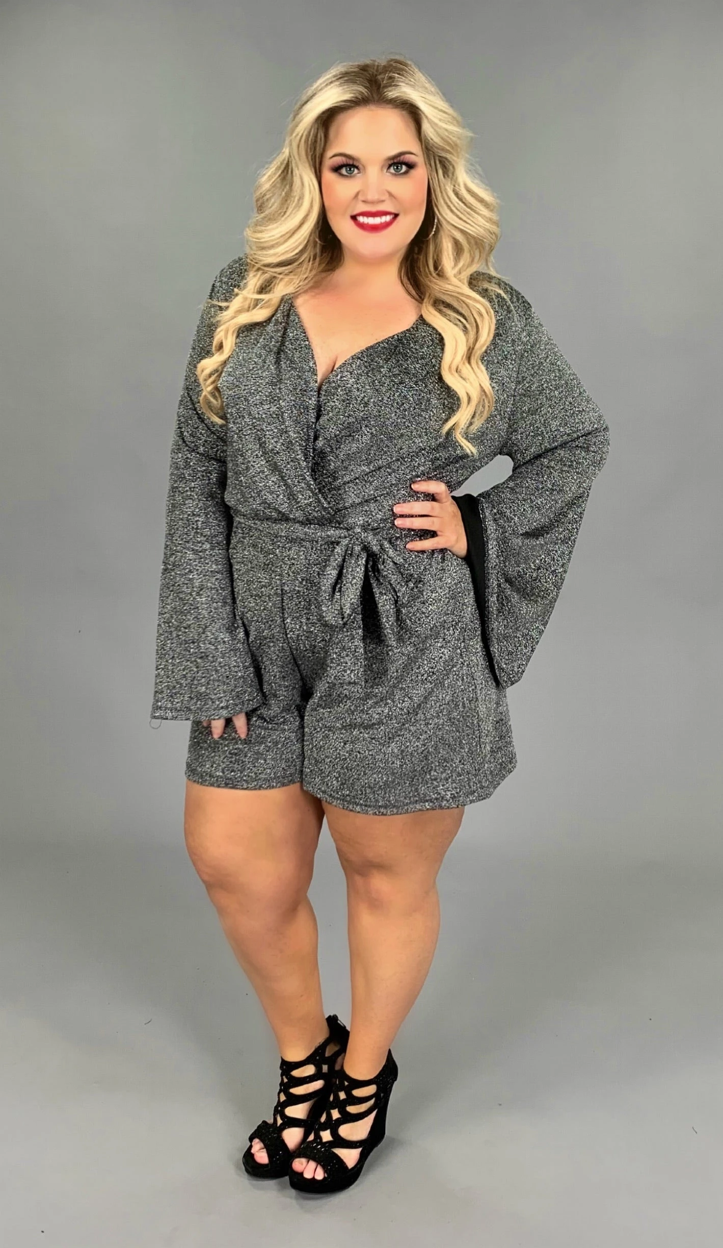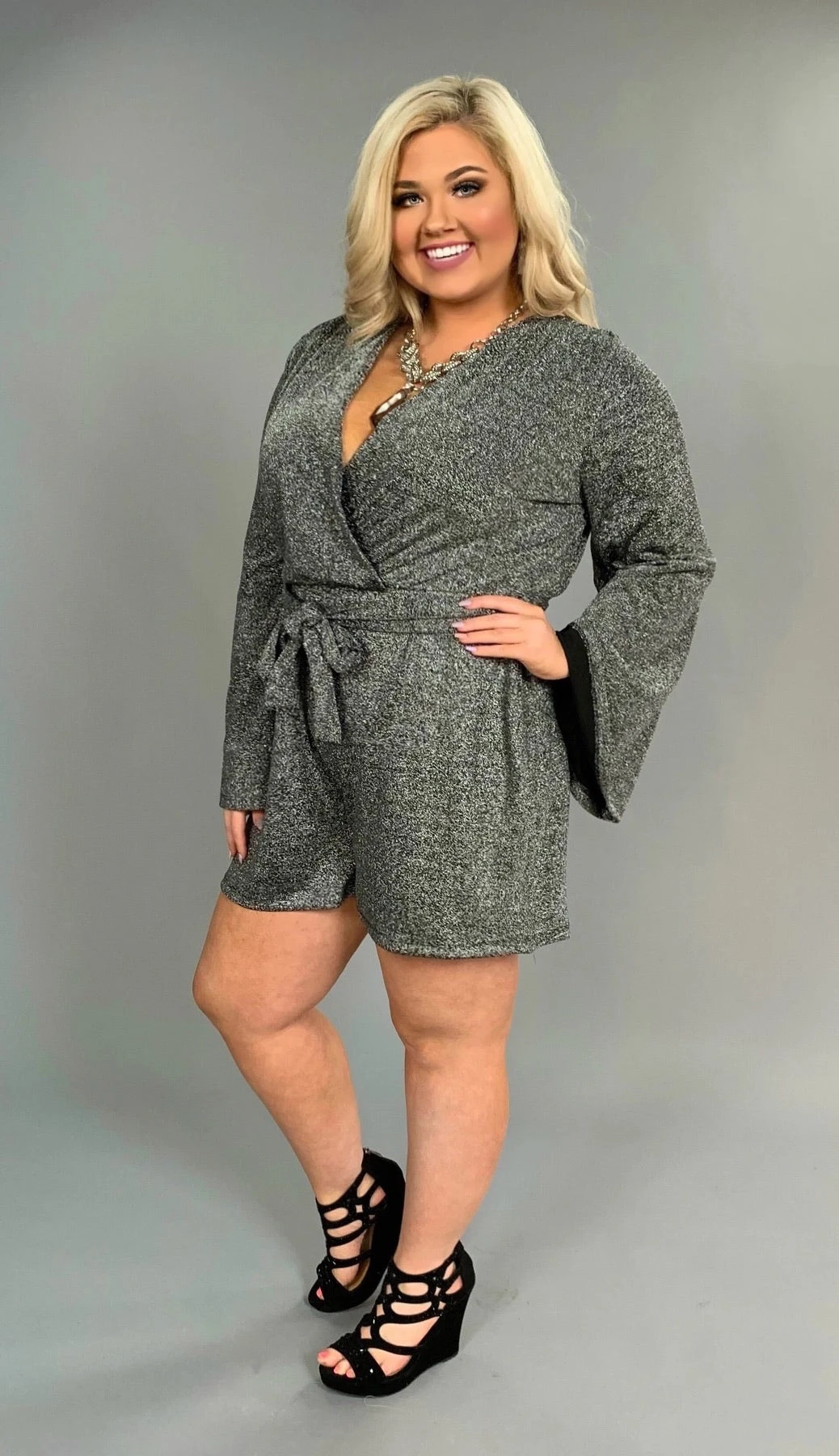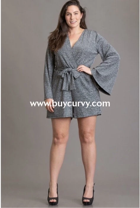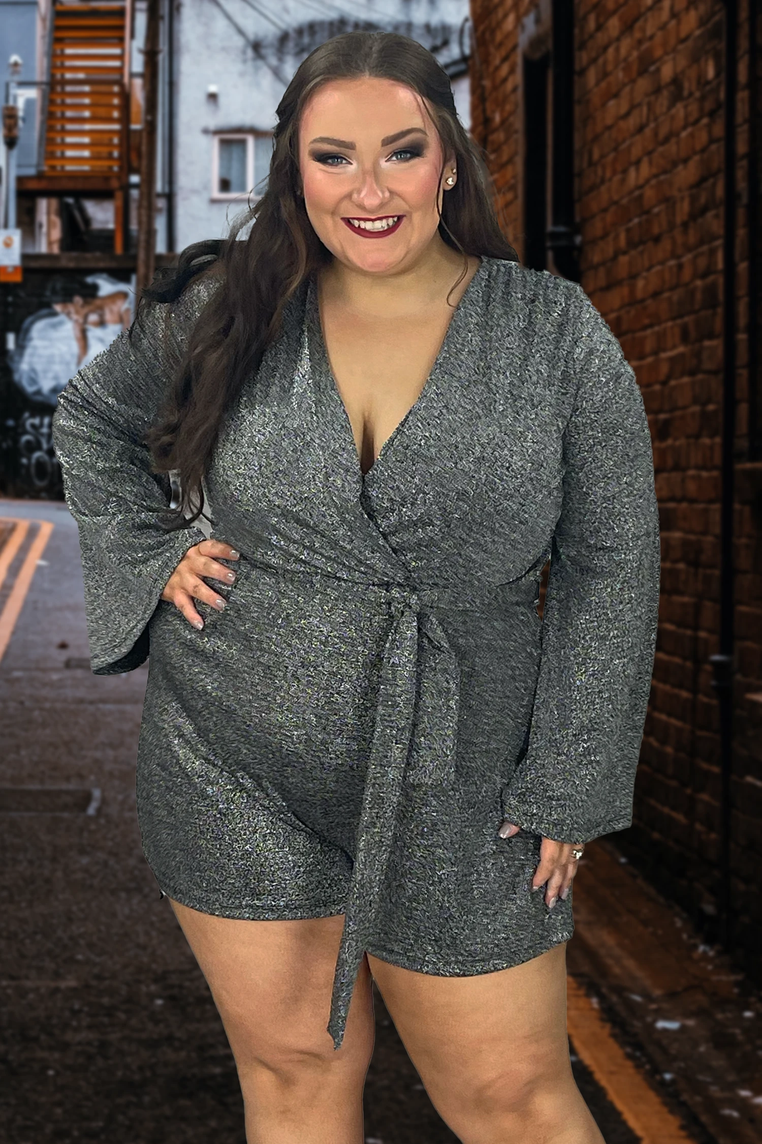 {All That Glitters} Silver/Black Angel Sleeve Romper with Tie Belt